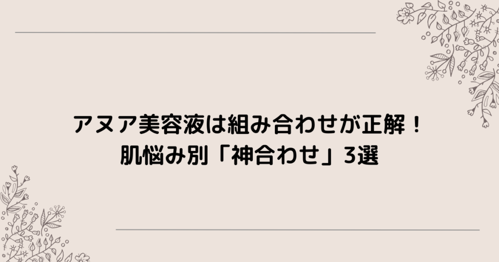 アヌアの美容液の組み合わせで迷っていませんか? 「どれとどれを一緒に使えばいい?」「自分の肌悩みに合う組み合わせは?」 結論から言うと、アヌア美容液は、肌悩み別に2本組み合わせるだけで効果が変わります。 どれを組み合わせればいいの?と迷った... ホームケア